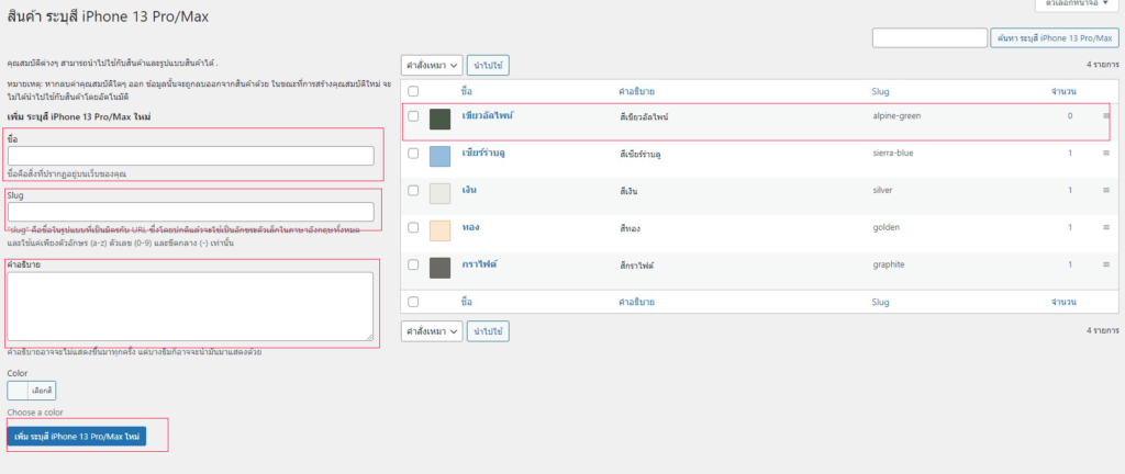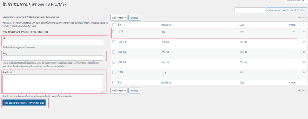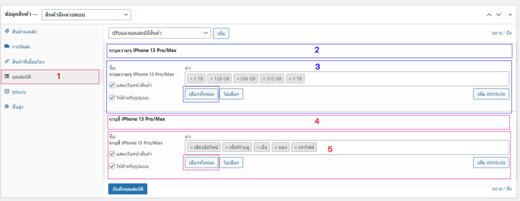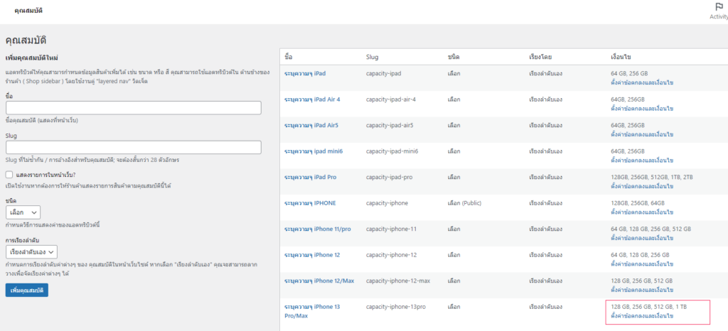 ปรากฎชื่อคุณสมบัติของสินค้า ตามภาพประกอบ ระบุความจุ iPhone 13 Pro/Max , ระบุสี iPhone 13 Pro/Max ( หากต้องการแก้ไข/เพิ่มเติมคุณสมบัติสินค้าต้องมาดูชื่อของคุณสมบัตินี้ทุกครั้ง )
