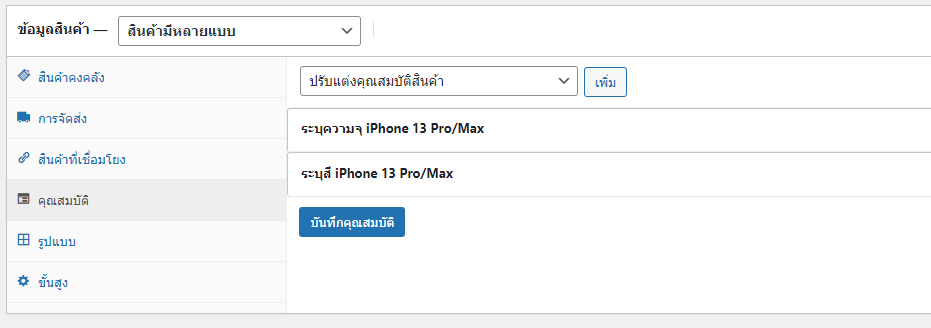 เพิ่ม/แก้ไข คุณสมบัติสินค้า (จากภาพตัวอย่างเป็นการเพิ่มคุณสมบัติให้สินค้า )