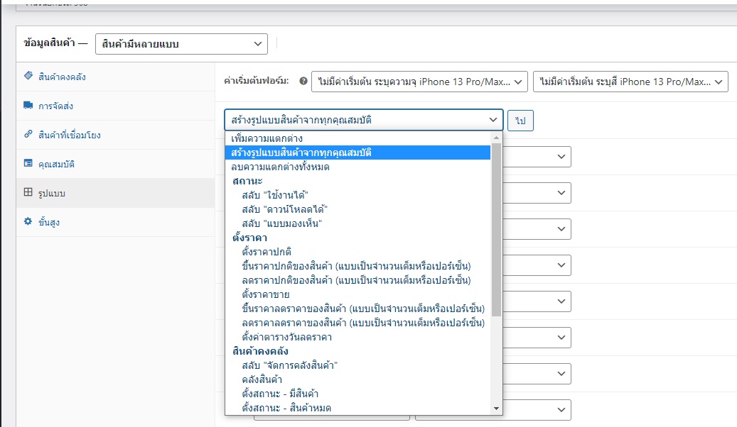 สินค้า >> ข้อมูลสินค้า : สินค้ามีหลายแบบ >> รูปแบบ >> เลือก สร้างรูปแบบสินค้าจากทุกคุณสมบัติ >> กดปุ่ม ไป