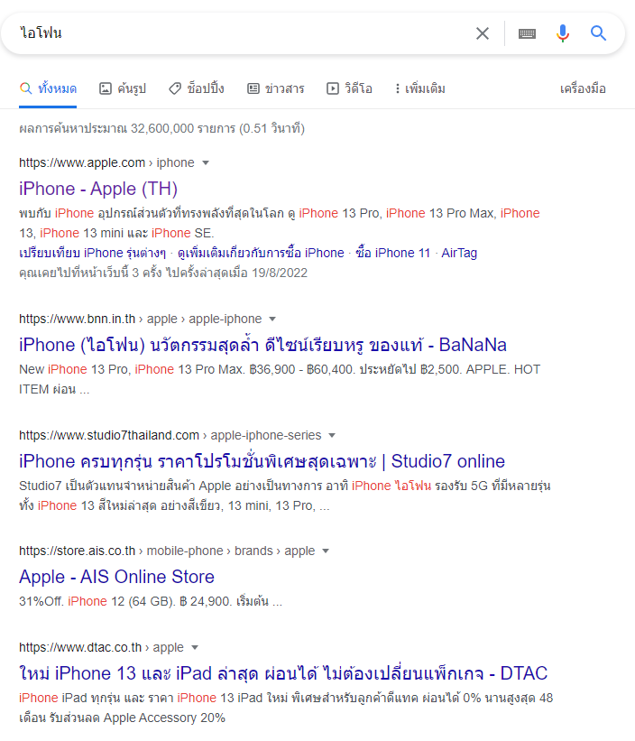 หรือตัวอย่างเพิมเติม : พิมพ์คีย์เวิด ไอโฟน แสดงผลลัพธ์เป็น เว็บ e-commerce การแสดงผลหน้าเว็บเราก็ควรเป็นเว็บอีคอมเมิร์ส