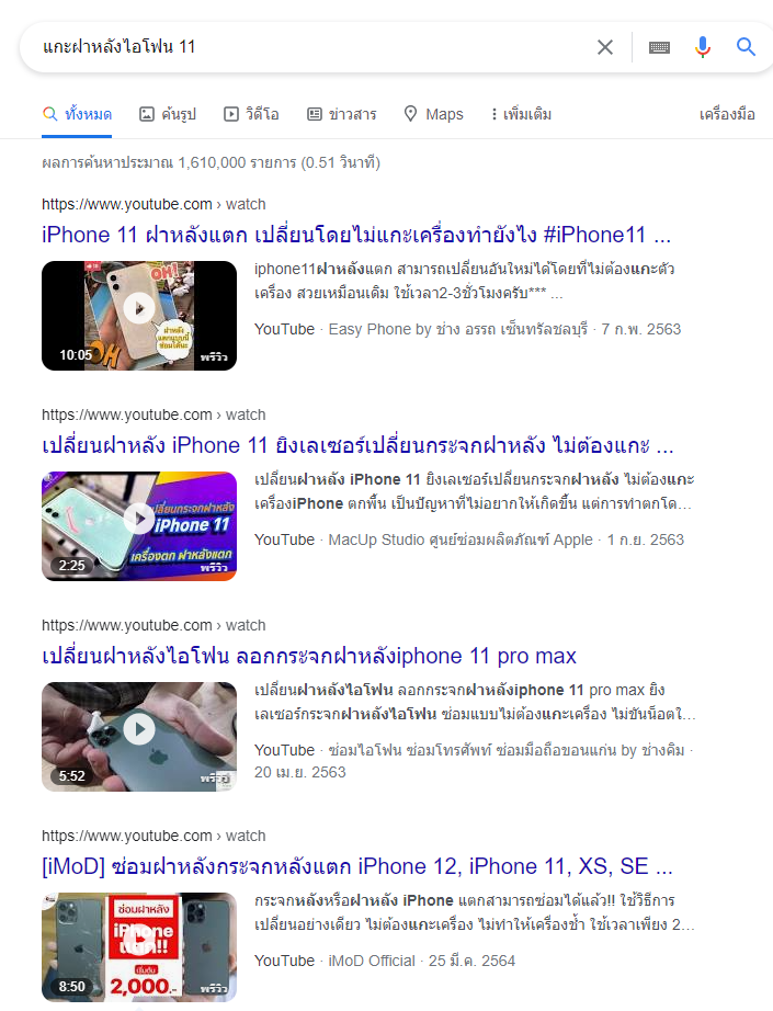 พิมพ์คีย์เวิด แกะฝาหลังไอโฟน 11 แสดงผลลัพธ์เป็น วีดีโอ youtube เราก็ต้องทำ วีดีโอยูทูป