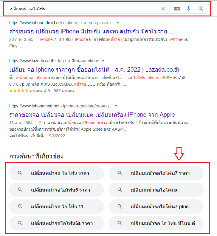วิธีเบื้องต้นดูจากผลการค้นหาที่เกี่ยวข้องที่แสดงอยู่ใต้ล่างผลการค้นหาบน Google