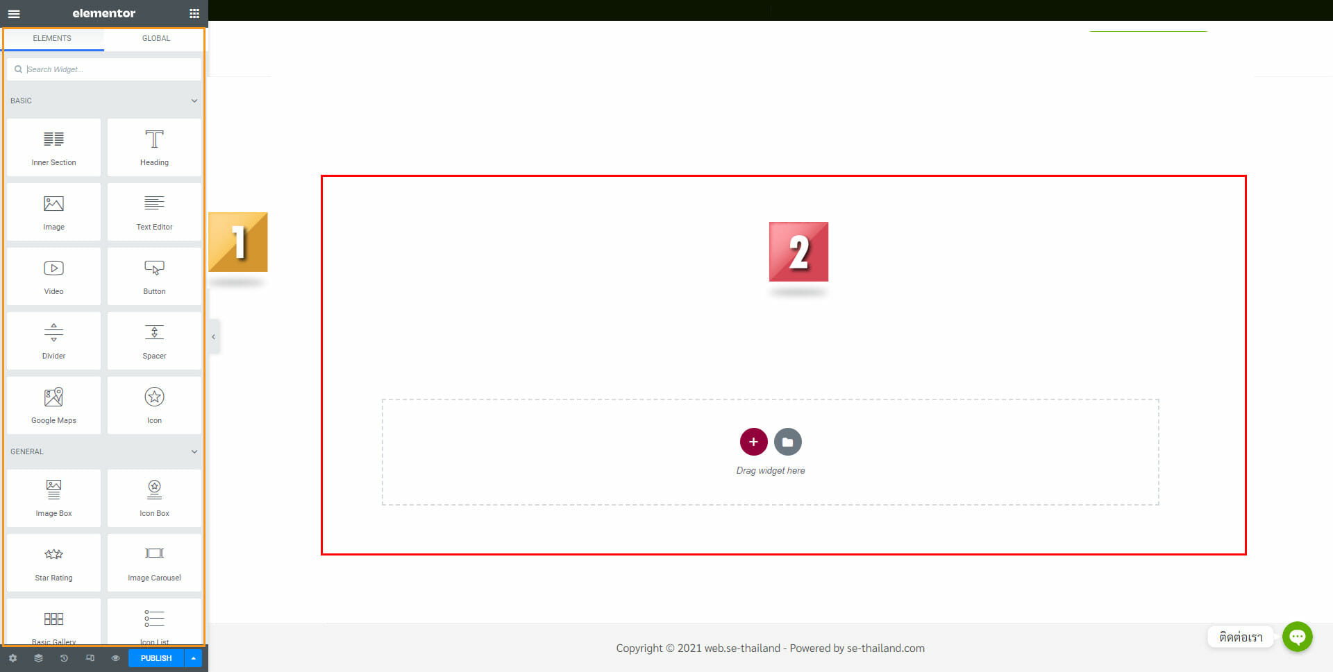 เครื่องมือ ปรับแต่งเว็บ Home คู่มือเว็บ เกี่ยวกับเว็บ เครื่องมือ ปรับแต่งเว็บ Elementor เป็นเครื่องมือที่ใช้ในการสร้าง / ปรับแต่งเว็บ คุณสมบัติเด่นๆ สามารถทำงานได้แบบเสมือนจริงทุกขั้นตอนDrag & Drop ลากวาง Wiget, Section, Column, Resize ได้โดยอัตโนมัติรองรับ Responsiveสามารถใช้งานร่วมกับ Widget ที่มีอยู่ได้ วีดีโอ-ภาพรวมของ Elementor 1. โครงสร้างของ Elementor จากภาพ ในหน้าจอ Elementor แบ่งออกเป็น 2 ส่วน 1. Widgets Area – พื้นที่วิดเจ็ต ประกอบด้วย Widgets ต่าง ๆ 2. Editing Area – พื้นที่แก้ไขหน้าเว็บ สำหรับsection ที่ต้องการ ระบบก็จะสร้าง column สำหรับลาก widget เพื่อเพิ่มคอลัมน์นั้น