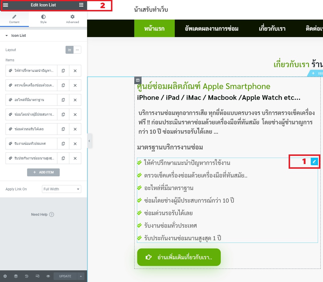 ปรับแก้ส่วนนี้ ? Home คู่มือเว็บ ปรับแก้ส่วนนี้ ? คำถาม : ปรับแต่งแก้ส่วนนี้จะต้องดูสารบัญเว็บหน้าไหน ? คำตอบ : คลิ๊กตรงรูป ดินสอสีฟ้า ตามภาพหมายเลข 1 คลิ๊กตรงรูป ดินสอสีฟ้า ตามภาพหมายเลข 1 จะปรากฎชื่อของ Widget ตัวอย่างตามภาพ คือ Icon Listหาชื่อ Icon List ในสารบัญเว็บของคู่มือปรับแต่งส่วนเนื้อหา