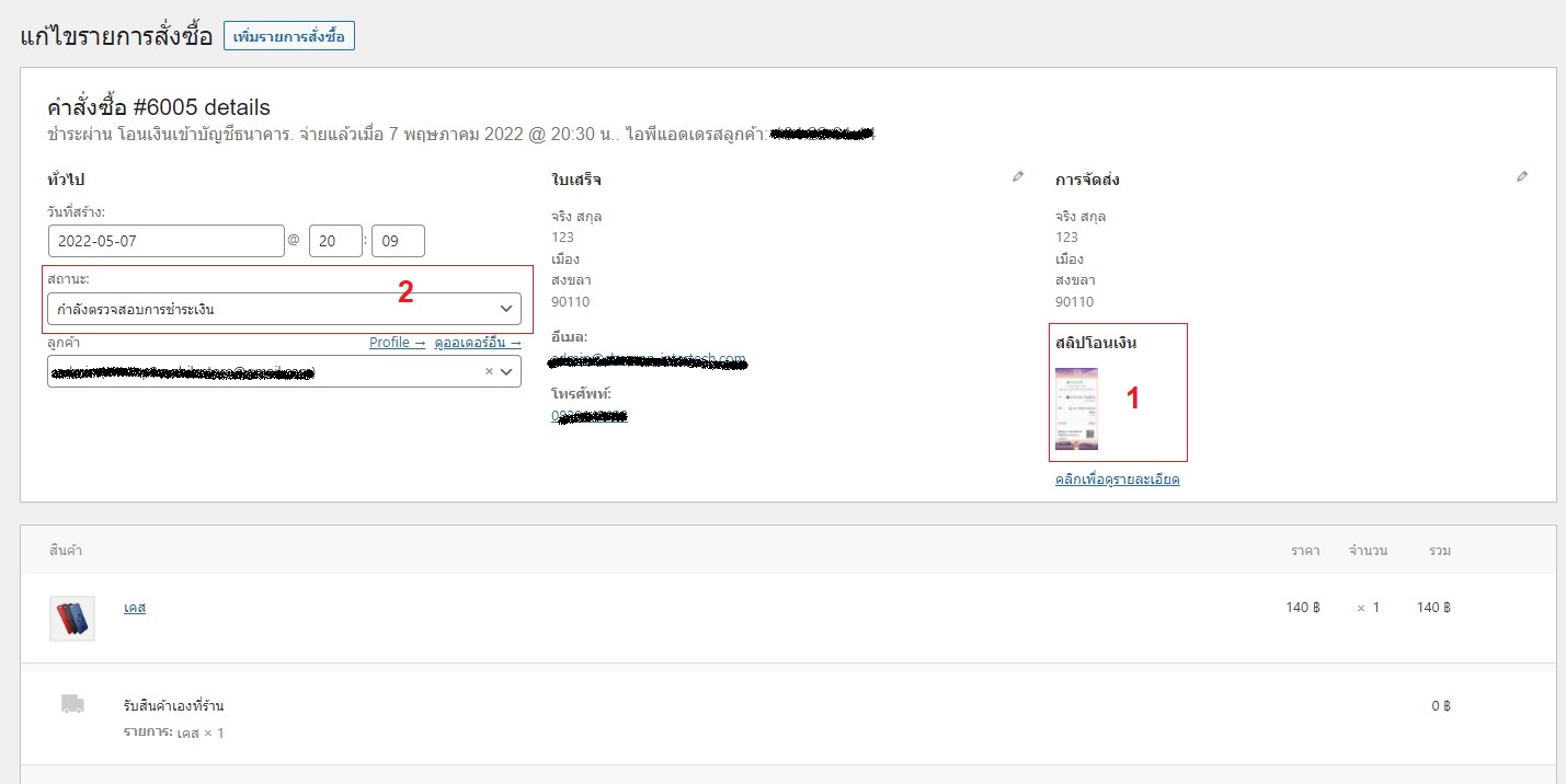 สังเกตุได้จากภาพจะมี ภาพสลิบโอนเงิน ตามหมายเลข 1 และสถานะกำลังตรวจสอบการชำระเงิน ตามหมายเลข 21-1-2 พนักงานตรวจสอบว่าลูกค้าชำระเงินถูกต้อง > ปรับสถานะคำสั่งซื้อกำลังเตรียมสินค้าเพื่อจัดส่ง ( พนักงานเป็นคนปรับ ) > แจ้งเตือนผ่านไลน์ฝ่ายจัดส่งสินค้า > ส่งของแล้ว ( พนักงานเป็นคนปรับ ) หรือสถานะอื่นๆต่อไป