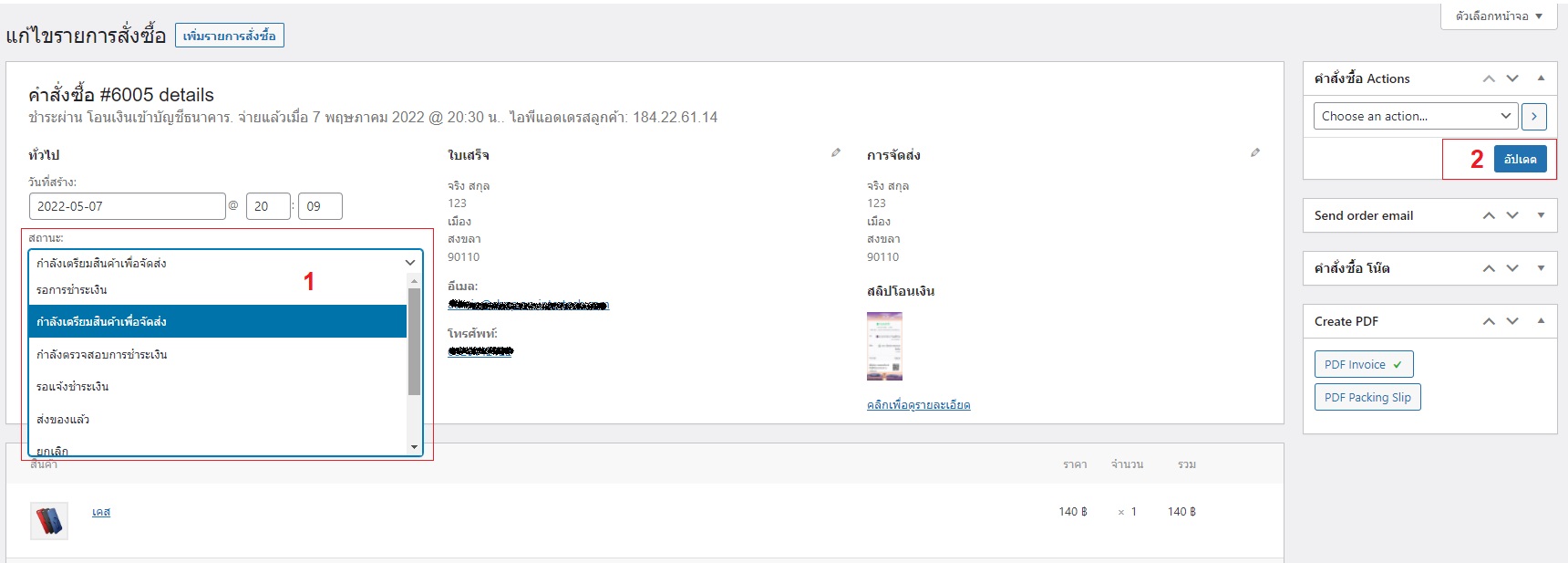 ปรับสถานะคำสั่งซื้อตามภาพหมายเลข 1 และกดอัพเดต ตามภาพหมายเลข 2 ( ต้องกดอัพเดตทุกครั้งที่มีการปรับสถานะ ห้ามลืม!!)