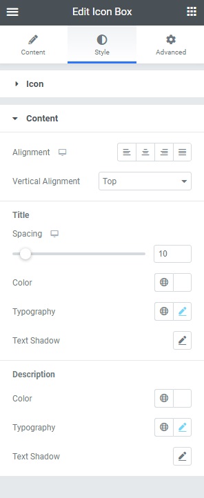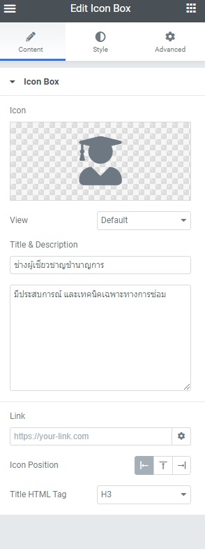 16.Icon Box Home คู่มือเว็บ เว็บแสดงข้อมูล 16.Icon Box แก้ไขตามภาพหมายเลข 16 วีดีโอ-ปรับเปลี่ยน/แก้ไข/เพิ่มเติม Icon Box Editing Area – พื้นที่แก้ไขหน้าเว็บ 1. คลิ๊กตำแหน่งที่ต้องการแก้ไข สังเกตมุมขวาจะมีสัญลักษณ์รูป ดินสอสีฟ้า 1. เปลี่ยนไอคอน Widgets Area >> Content >> Icon** กดปุ่ม INSERT ** 2&3. เปลี่ยนข้อมูล Title & Description – ข้อมูต่าง ๆ Icon Position – ตำแหน่งไอคอน เปลี่ยนสีไอคอน Widgets Area >> Style >> IconPrimary Color -สีไอคอนSpacing – ระยะห่างระหว่างไอคอนกับข้อความSize – ขนาดไอคอน เปลี่ยนสีข้อความ Widgets Area >> Style >> ContentAlignment -จัดตำแหน่งข้อความVertical Alignment – จัดตำแหน่งไอคอน Title Spacing – ระยะห่างระหว่างข้อความ Widgets Area >> Style >> TitleTypography >> Size – ขนาดตัวอักษรTypography >> Weight – น้ำหนักตัวอักษร กดปุ่ม UPDATEทุกครั้งเมื่อตั้งค่า / ปรับแต่ง /แก้ไข / เพิ่มเติม กดปุ่มอัพเดต อยู่บริเวณด้านล่างในส่วนของ Widgets Area กดปุ่ม Preview Changesดูการแสดงผลของหน้า ที่เราเปลี่ยนแปลง