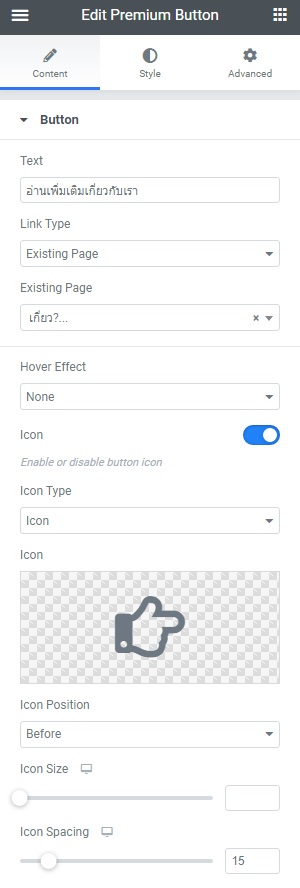 8.Premium Button Home คู่มือเว็บ เว็บแสดงข้อมูล 8.Premium Button แก้ไขตามภาพหมายเลข 8 วีดีโอ-ปรับเปลี่ยน/แก้ไข/ ปุ่ม ( Button) Editing Area – พื้นที่แก้ไขหน้าเว็บ 1. คลิ๊กตำแหน่งที่ต้องการแก้ไข สังเกตมุมขวาจะมีสัญลักษณ์รูป ดินสอสีฟ้า 1. ปุ่ม Widgets Area >> ContentContent >> Button – ปุ่มText – ข้อความLink Type – ลิงค์ของปู่มIcon – ไอคอน ของปุ่มIcon Position – ตำแหน่งของปุ่มIcon Size – ขนาดของปุ่มIcon Spacing – ระยะห่างระหว่างปุ่มกับข้อความ Icon – ไอคอนกดปุ่ม INSERT Size – ขนาดของปุ่มAlignment >> ตำแหน่งของปุ่ม 2. รูปแบบชุดข้อความ Widgets Area >> Style Button >> Typography – รูปแบบตัวอักษรText Colour – สีข้อความIcon Colour – สีไอคอนBackground Color – สีของปุ่มBorder Radius – ทำมุมให้กับปุ่มPadding – ระยะของปุ่ม Button >> Typography – รูปแบบข้อความTypography >> Size : ขนาดข้อความTypography >> Weight : น้ำหนักข้อความ กดปุ่ม UPDATEทุกครั้งเมื่อตั้งค่า / ปรับแต่ง /แก้ไข / เพิ่มเติม กดปุ่มอัพเดต อยู่บริเวณด้านล่างในส่วนของ Widgets Area กดปุ่ม Preview Changesดูการแสดงผลของหน้า ที่เราเปลี่ยนแปลง